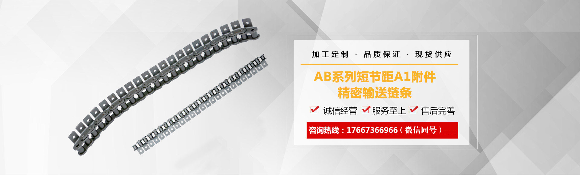 1、鏈條產(chǎn)品有各種不銹鋼、碳鋼輸送鏈條、雙節(jié)距輸送鏈條、空心銷軸鏈條、不銹鋼塑料平頂鏈、不銹鋼精密滾子鏈、特殊工礦輸送鏈、耐高溫輸送鏈條、非標鏈條、彎板非標鏈條、大節(jié)距輸送鏈條、各種鏈條用滾子(材質(zhì)碳鋼、不銹鋼)等。
